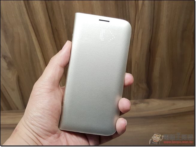 接下来介绍一下Galaxy S7 edge的周边,这次与手机同步发售的还包括了LED VIEW COVER皮革翻页式皮套,装上手机后会在正面上方显示时间等信息,与之前有透视窗的设计差异很大: