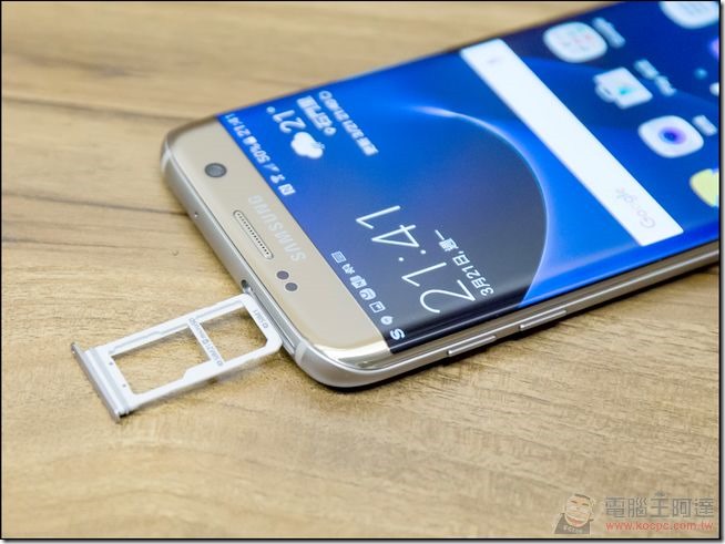 Galaxy S7 edge支持双卡双待与Micro SD记忆卡扩充储存容量,透过退匣针取出Galaxy S7 edge SIM卡托盘,就可看到两组设计不同SIM卡安装处: