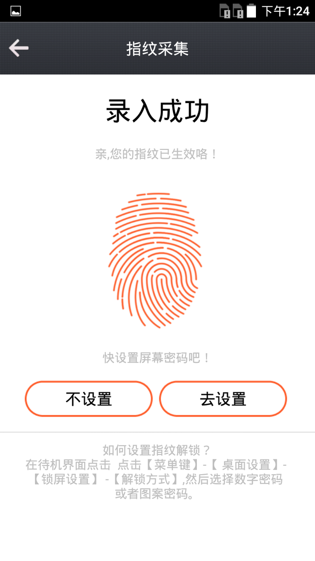 在指纹识别入录进行后,会提醒客户设定显示屏的解锁密码,而且有小贴士提示怎么使用指纹识别作用:要是客户应用的开启方法为数字密码或是图案密码,皆能够 应用指纹识别显示屏。